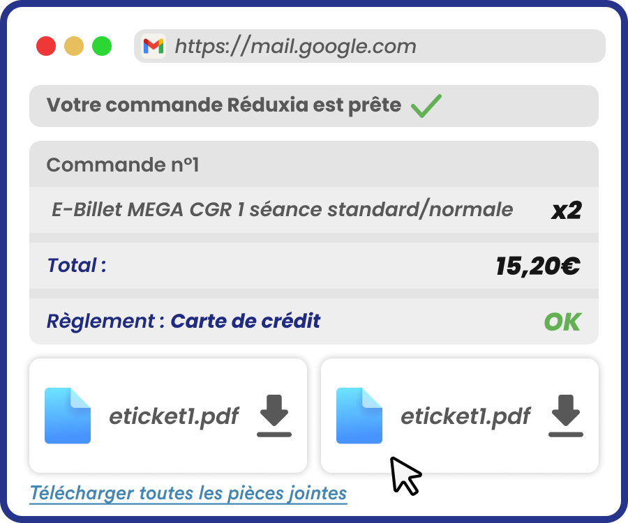 Une fois votre commande passée, vous recevrez instantanément un e-mail de confirmation avec votre e-billet, bon cadeau ou code internet. Toutes les offres sont dématérialisées avec une réception immédiate. Aucun besoin de suivre l’état de votre commande.